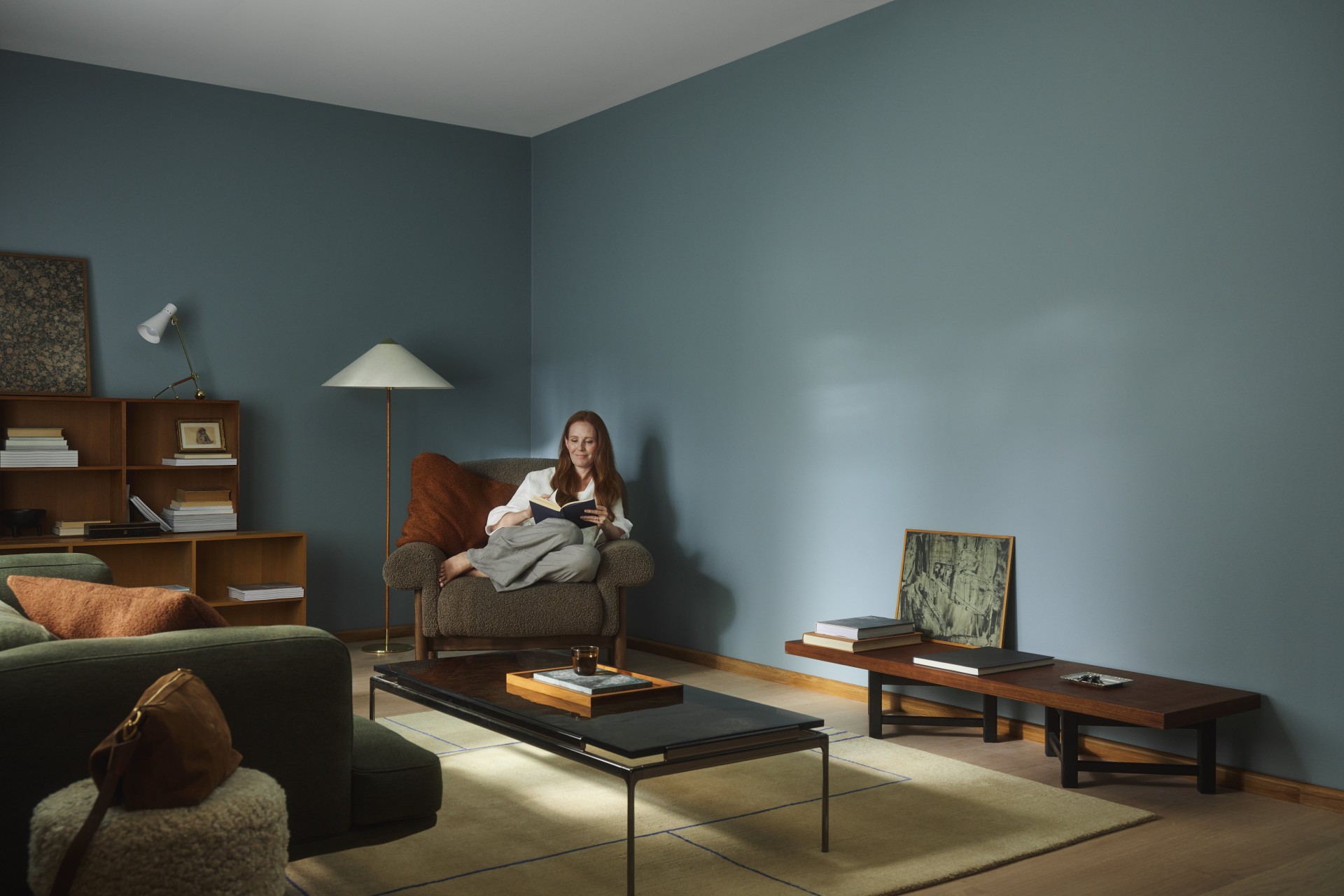 Furnish a cosy corner for diving into your favourite novel with a comfortable seating set against a calming blue wall, such as MUTE Ocealis, which is a soft, muted blue teal with a serene feel.