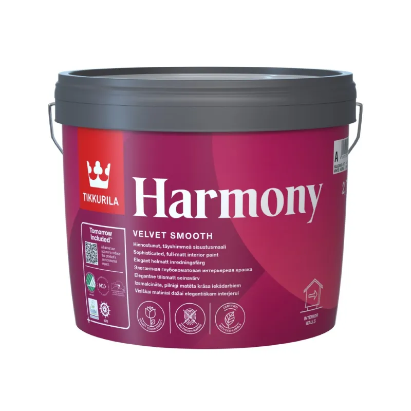 Harmony is one of the most eco-certified products in Tikkurila assortment. Formula has very low VOC-emission level, much below standard. That is proved by M1, EU Ecolabel and Nordic Swan certificates. Harmony paint is developed in cooperation with Finnish Allergy, Skin and Asthma Association