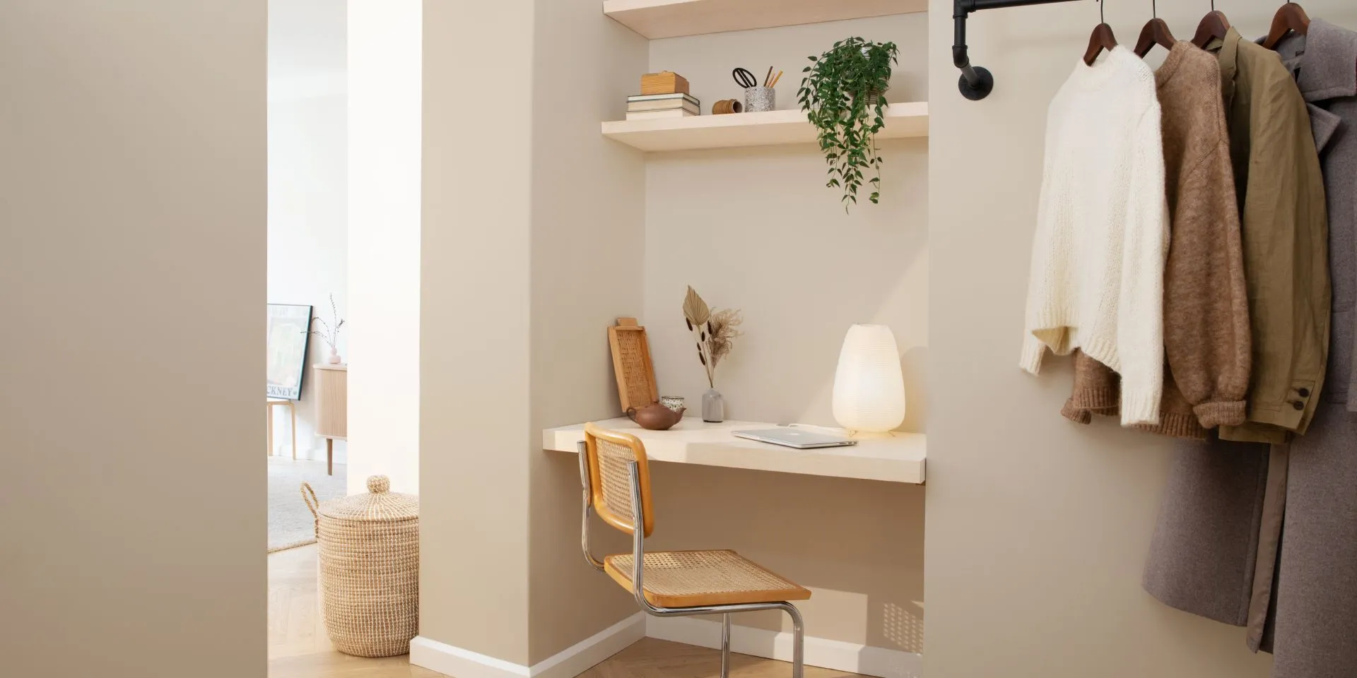 In this small home office the walls are painted with Tikkurila’s warm beige colour X459 Dream that is one of the key colours of bohemian style. Light beige colour gives a soft touch to the space and makes it feel harmonious and more thought-out. Warm-tinted wall colour combined with decorations made of organic materials create a relaxed atmosphere that is rare in traditional office spaces.