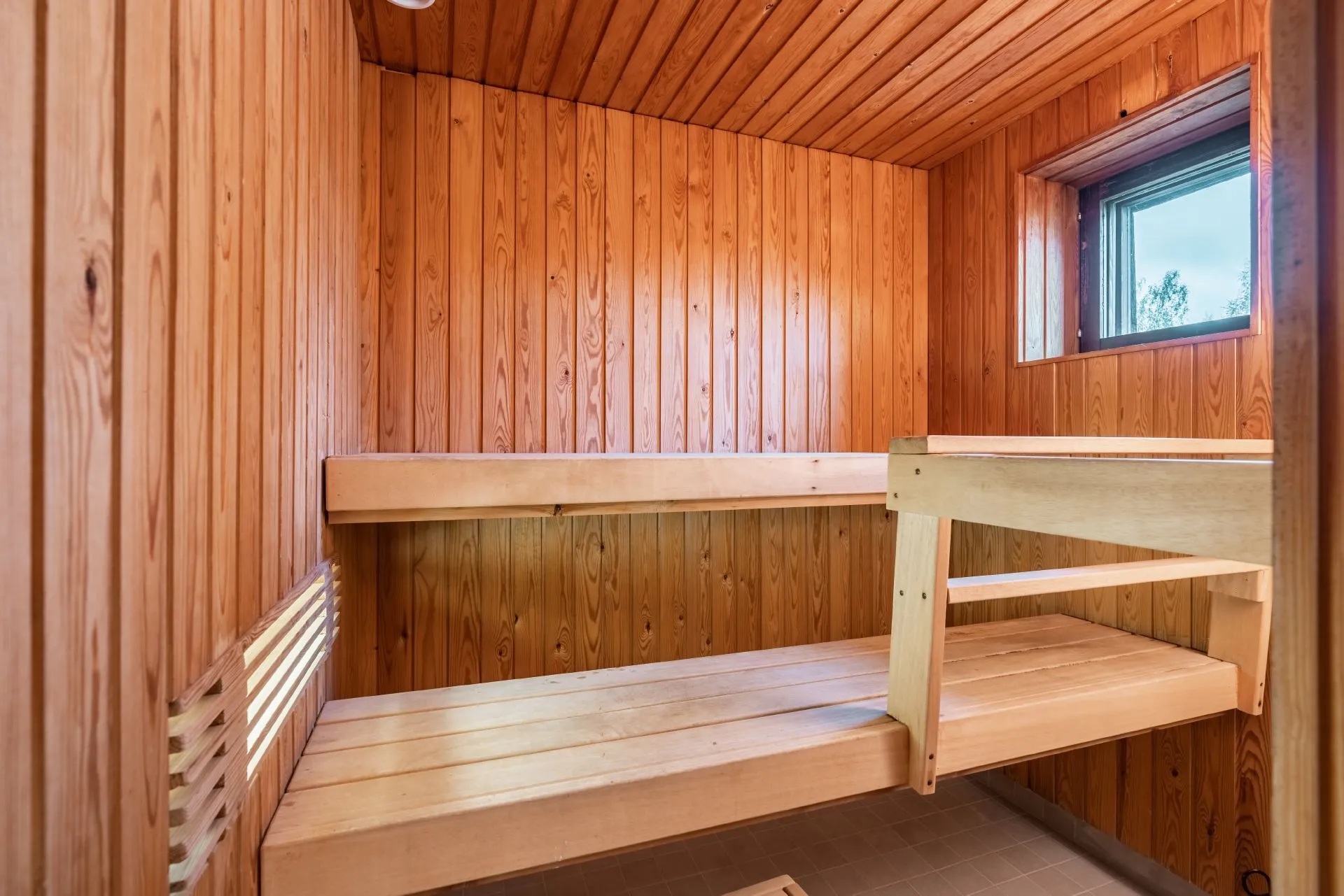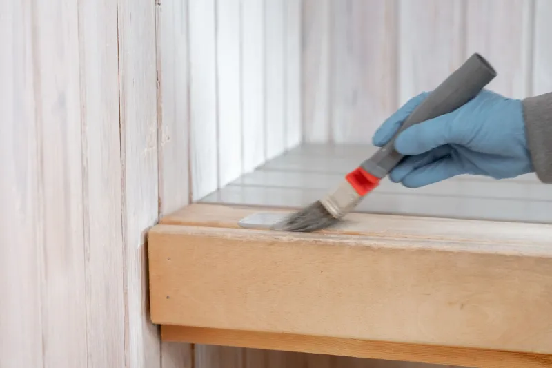 Wash the benches and walls using Supi Saunapesu. Use rubber gloves to protect your hands. Work with a scouring pad or a brush, especially if the surface has remains of a previous coating. Rinse all surfaces and let dry completely. Sand with fine sandpaper if there is small splinters come out of surfaces. Brush away all the sanding residue.