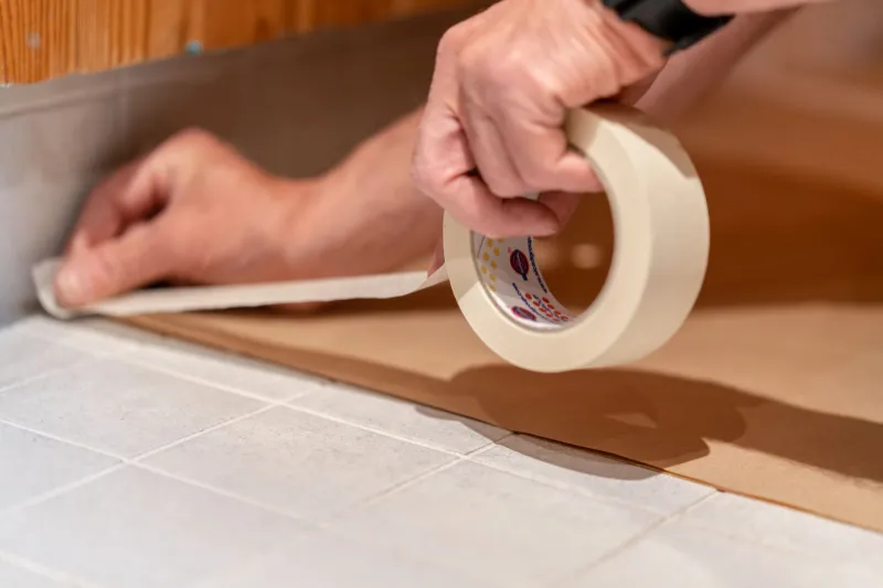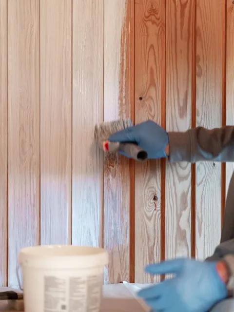 Gather all your tools and materials: Supi Saunavaha, a brush, covering paper and masking tape for covering the floor. Cover the surrounding area. If the benches are detachable, it might be easier to treat them outside the sauna and treat the walls without benches in the way. You can also just leave the benches at their place, cover the benches with plastic and treat the walls first.