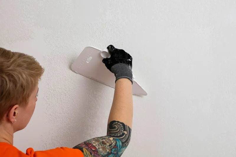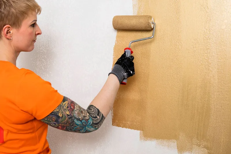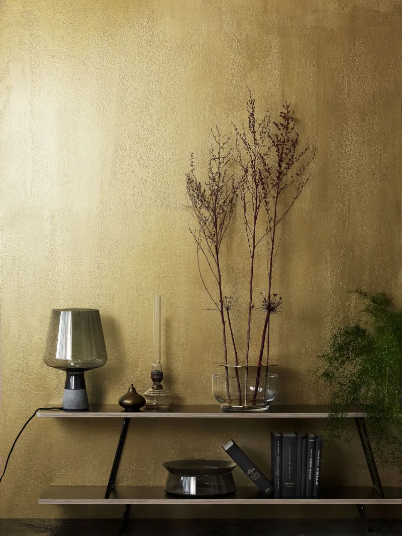 4. Apply the golden Taika Pearl Paint with a roller and wipe the wet paint surface immediately with a rubber spatula using vertical movement.