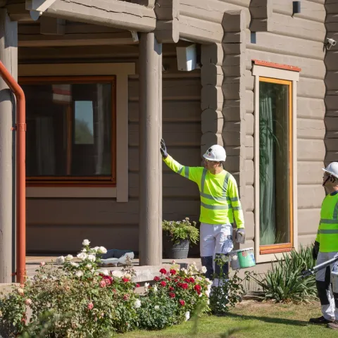 When the house was built, it was painted with a Tikkurila wood stain in a brown-orange shade. It was time to renovate the façade, but I faced two challenges: first, choosing the most suitable and durable coating for log houses; and second, selecting a colour that would blend in with the landscape as the house sits on a hill, visible from afar. The new colour also needed to complement our friends' house next door, which is coated with Tikkurila paint in a dark shade.