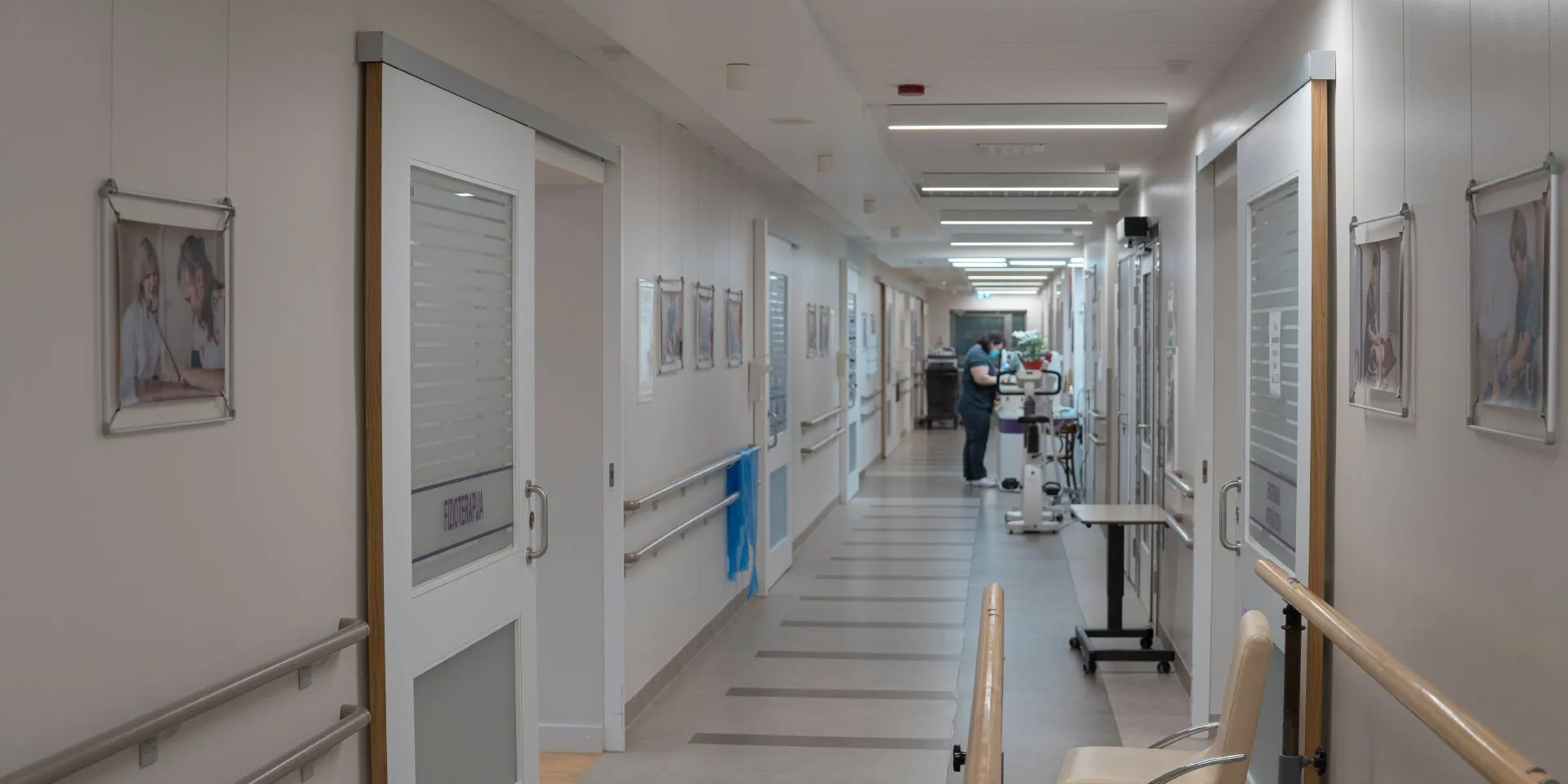 The grounding grey and brown shades F428 and X484 were chosen for the corridors in the rehabilitation department, while the neurology wards were painted with the calming green NCS S 0540-G50Y.